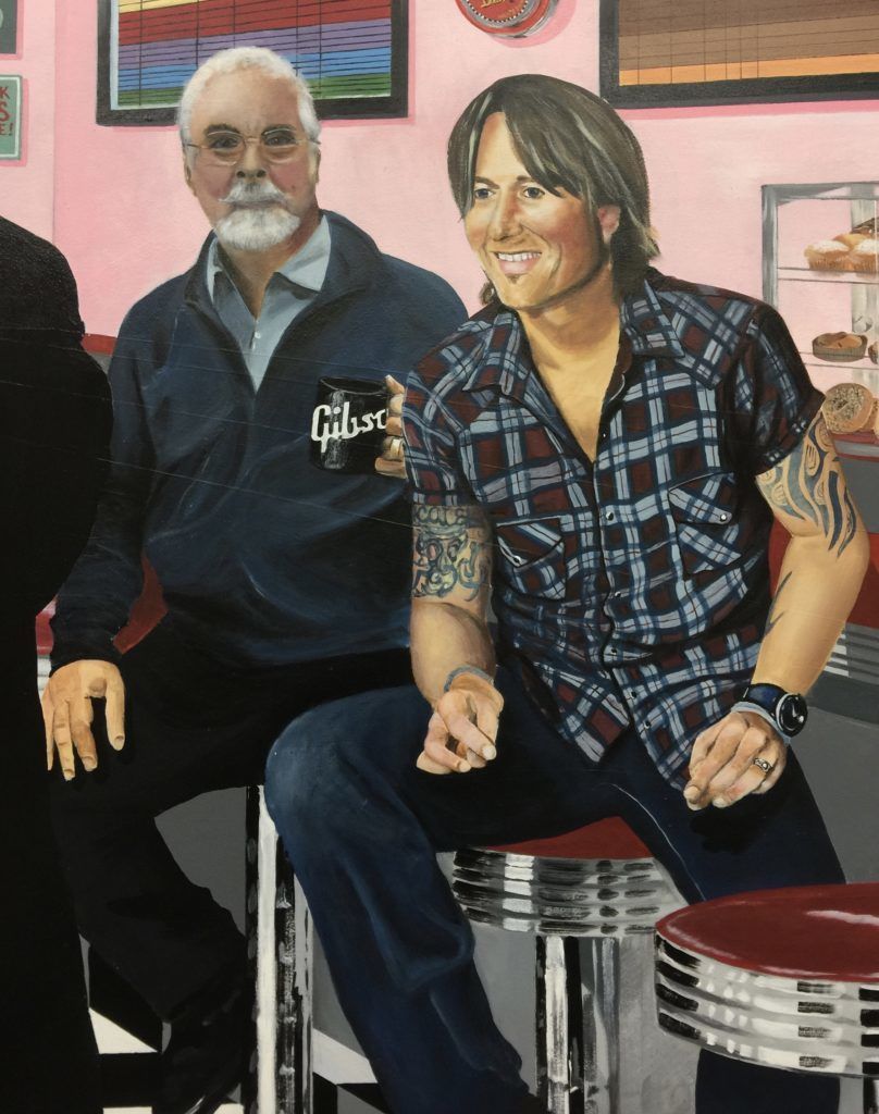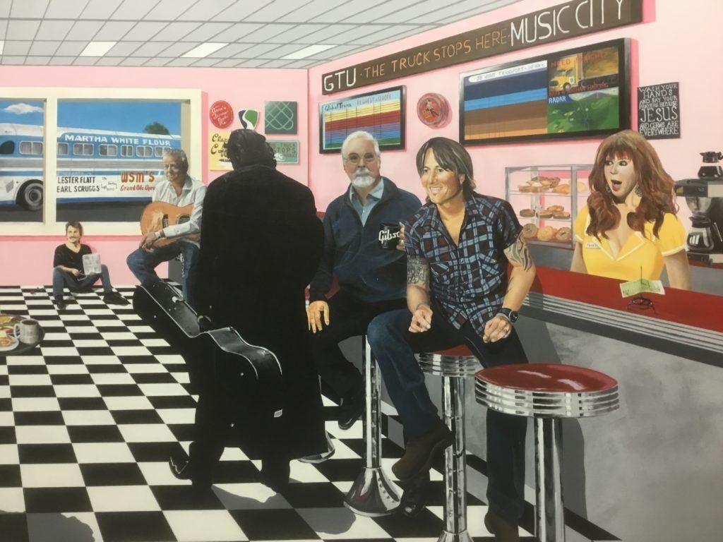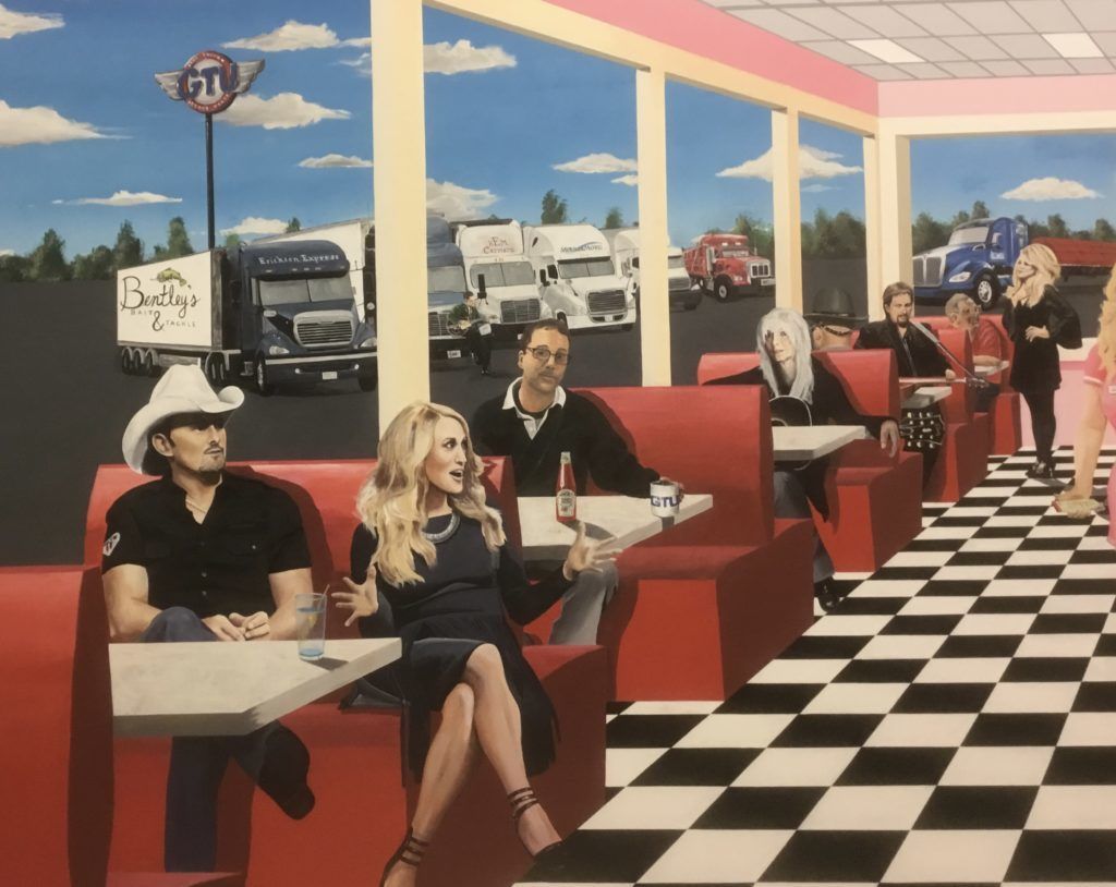 Interior Canvas Mural for Greenwich Transportation Underwriters, or GTU. This is the second mural we have done for them. Located in their Break Room, this 9′ x 20′ piece features 13 music icons, as well as the two owners. The musical legends are as follows: Brad Paisley, Carrie Underwood, Chet Atkins, Emmylou Harris, Jerry Douglas, Vince Gill, Alison Krauss, Dolly Parton, John Prine, Tommy Emmanuel, Johnny Cash, Keith Urban and Reba McEntire. The co-owners are Ward Stein and Ben Armistead, also featured.