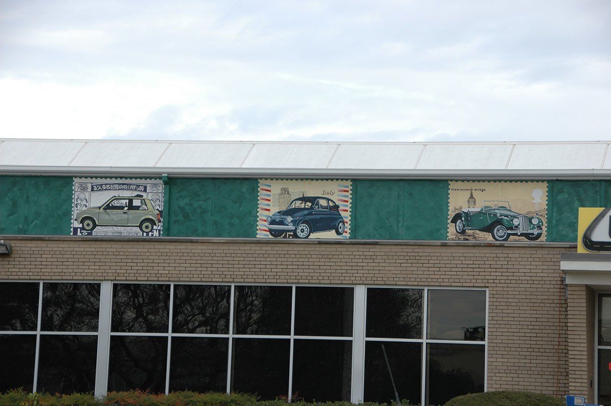 Exterior murals painted on the walls of the Lane Motor Museum in Nashville, Tennessee featuring several of the classic cars found within.