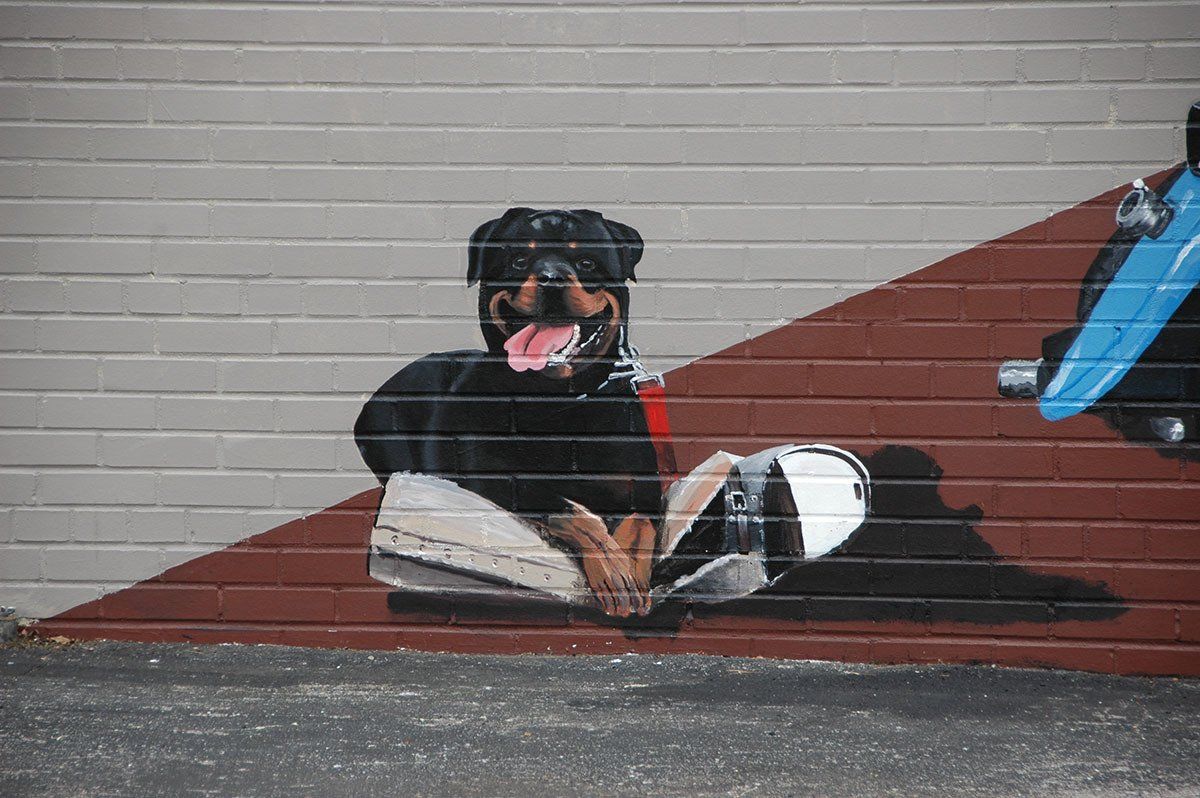 Here’s one we did out in College Grove. The client has two really old barns. They wanted murals painted on them but wanted to keep the character of the aged barns. So, we painted them to look like “Ghost murals”, faded, worn and weathered, giving the impression that the artwork had been there since the barns were new!