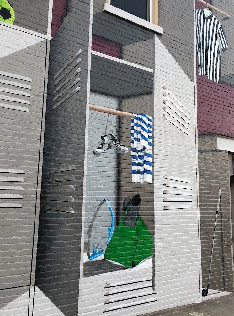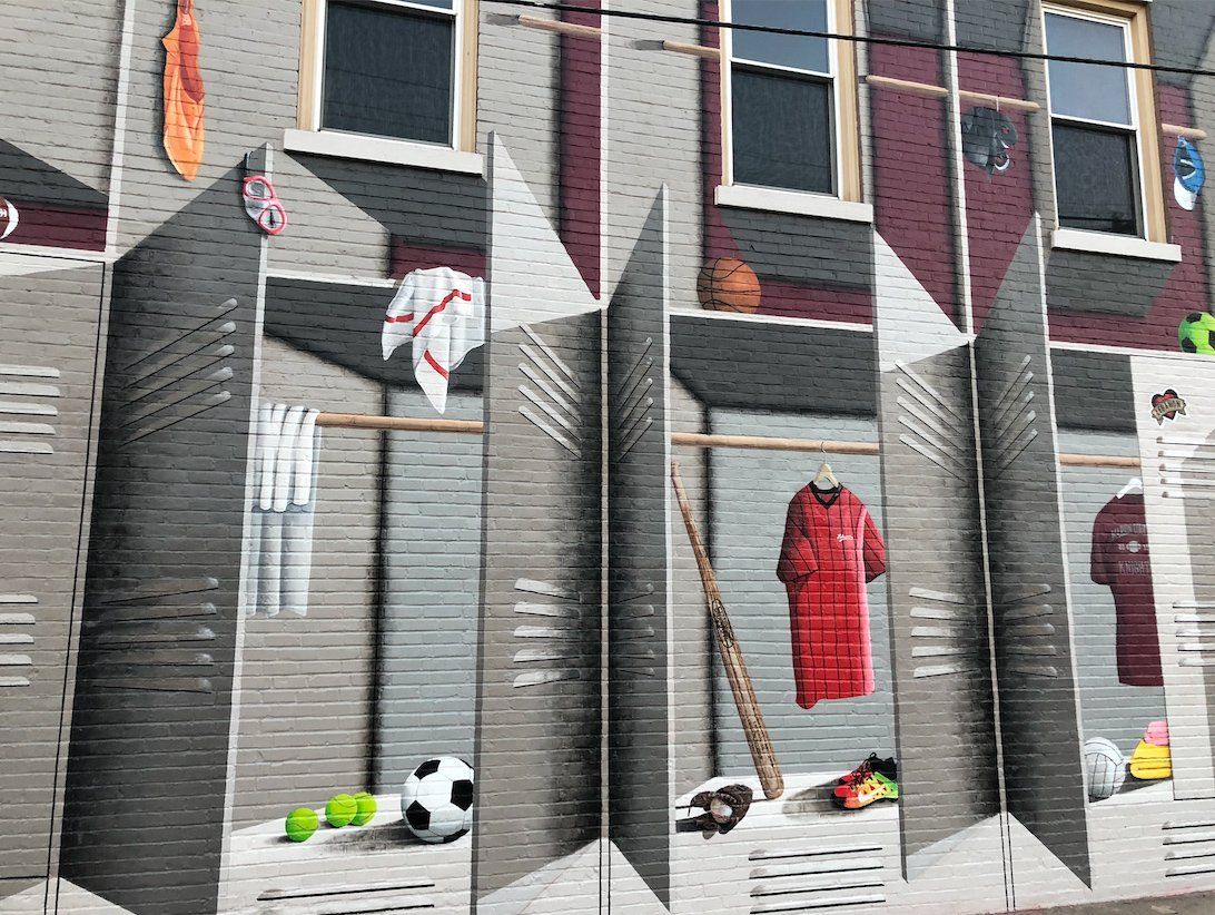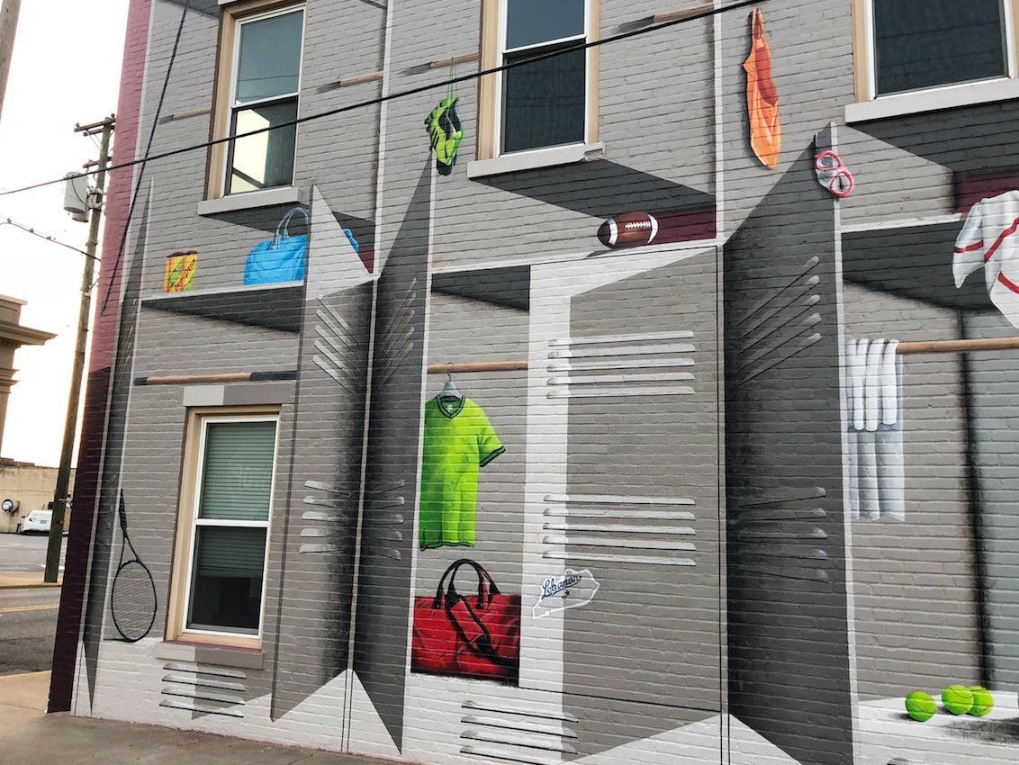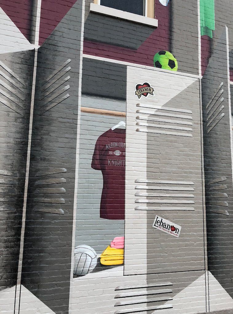 Wow! Our third mural for the town of Lebanon, Kentucky! They like us! They really like us! This one was to be designed with a completely different subject matter in mind: sports! It seems that there are tons of sporting events in Lebanon – Regional Baseball tournaments, Softball championships, Swim Meets, Football and Basketball games, Tennis matches, etc. Seems that Lebanon is quite the hotbed for sports, and they wanted to highlight that fact to their many visitors. So, we took the side of the Lebanon Enterprise building and turned it into a larger-than-life locker room, complete with all kinds of references to the various and sundry events that happen in and around Lebanon! Enjoy!