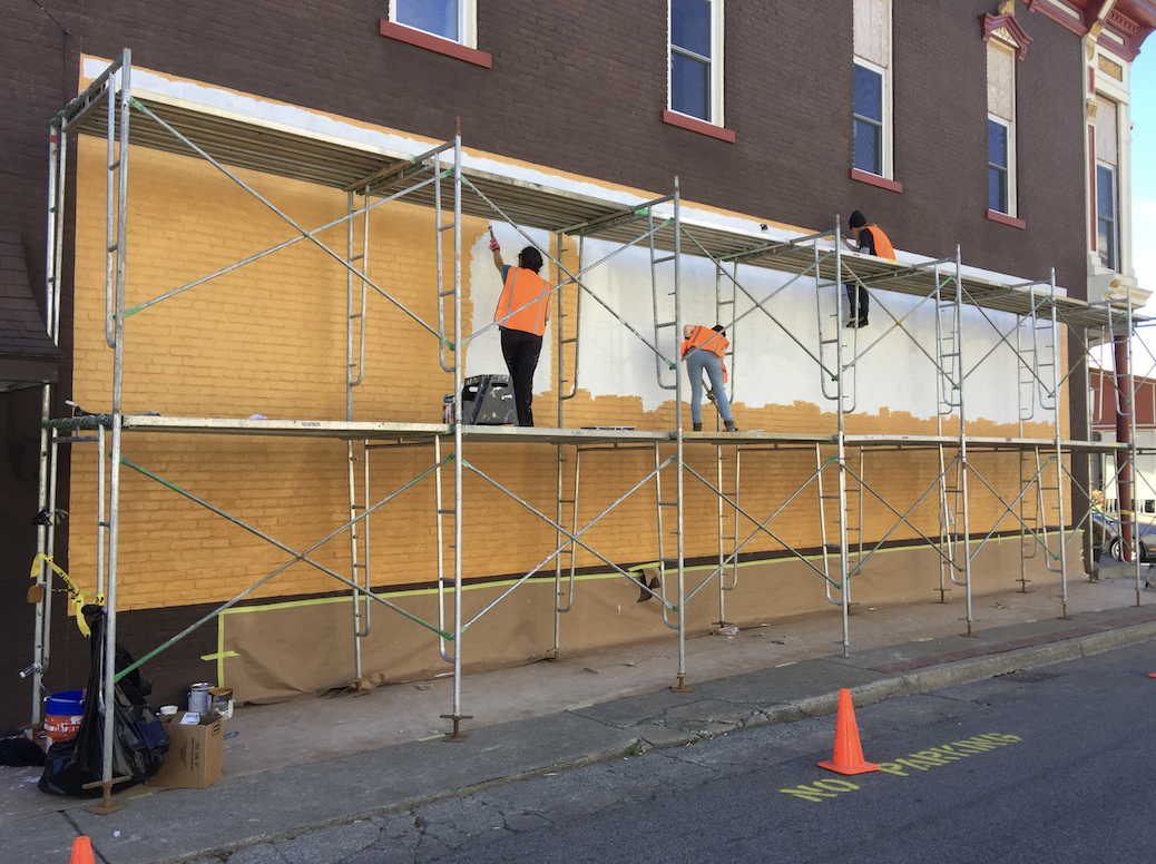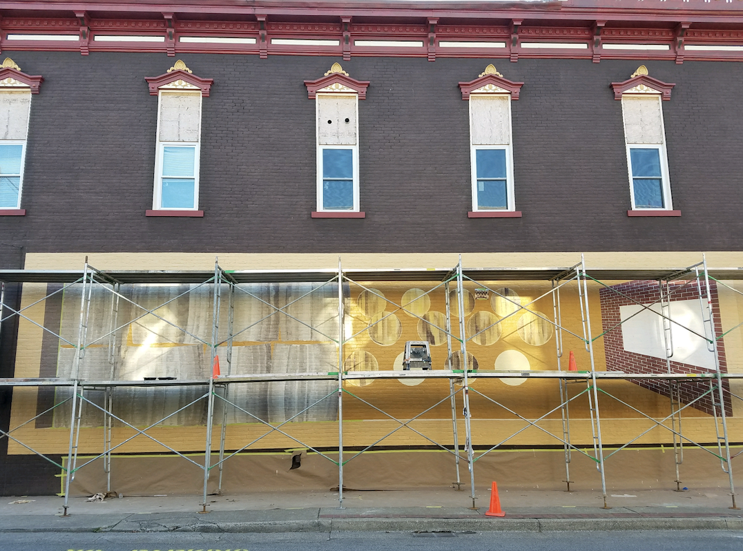 We were invited to paint a mural for the Chestnut Creek School of the Arts, in Galax, Va., outside of their Woodworking Studio. Over 60’ width of concrete walls to paint, but only 36” at the highest! Lots of laying on the ground, snuggled up in tents with heaters blowing full blast! This was Virginia in November - it was COLD! They wanted something to represent not only what their area is known for (like the birthplace of Bluegrass music!), but also what the School of the Arts is famous for: quilts, woodworking, etc. So we painted 3-dimensional display cases featuring banjos, fiddles, mandolins, etc., as well as things to do outside, like maps, hiking boots, bicycle equipment, etc., and various hand-made artwork. And of course, Galax plants! One of my most favorite projects! And the people there were the best! Looking forward to going back again to paint more walls!