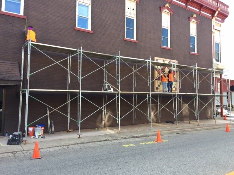 This project is probably the second largest we’ve ever done, relative to actual square footage. We had to paint custom graphics and signage on the exterior of a massive condo complex in the Wedgewood/Houston area of Nashville. Not only was it seven stories high, but it was on a heavily corrugated metal surface! Lots of “chevrons”, angles, numbers and letters, specified to be painted in all of the weirdest places. We used 85’ and 125’h articulated lifts, 45’ scissor lifts, and multiple widths of swing stages. Some of the letters were 30’h! We painted three coats on all of the white graphics on the green surfaces. The only dark paint used was for the name of the complex, which is “The Finery”. Lots of really hot days, dead in the sun, tons of wind, rain, etc., but we finished after about 3 weeks. Not too shabby!