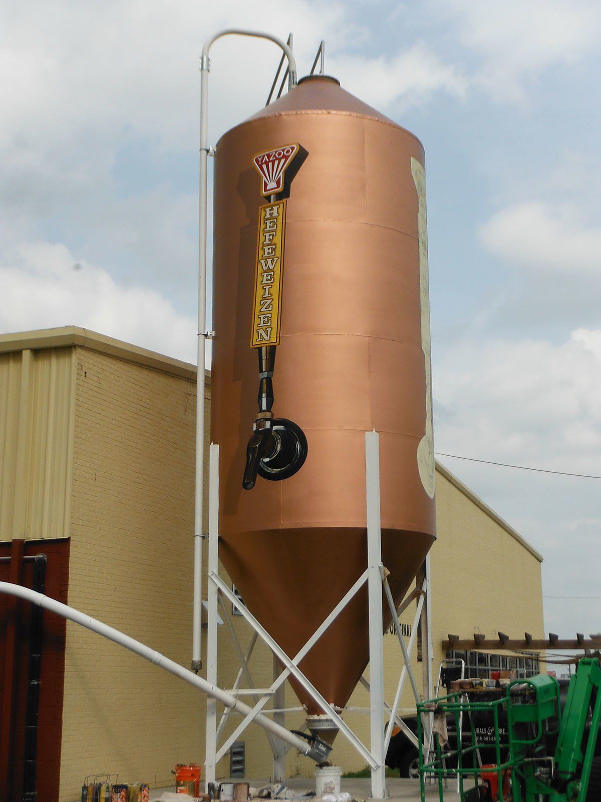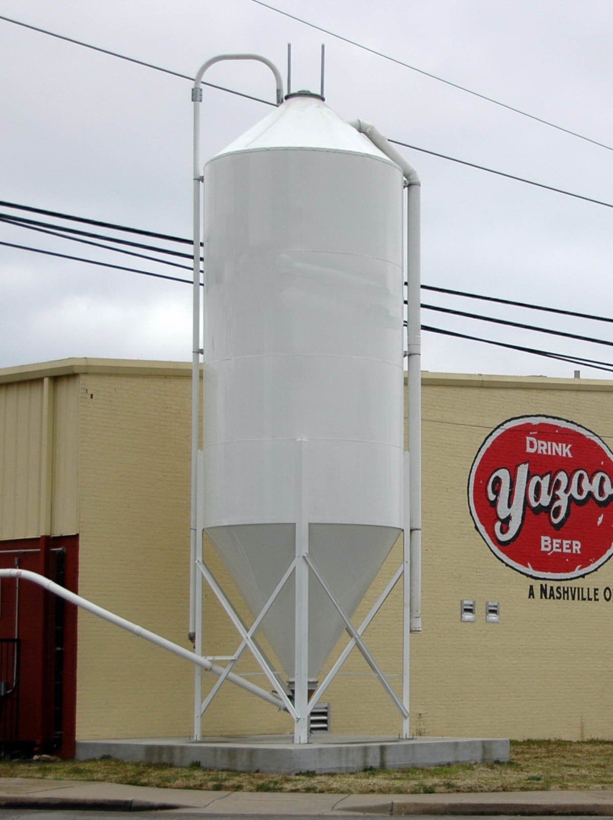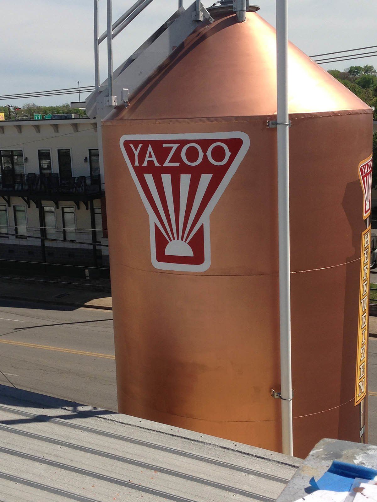 Exterior signage on the exterior wall and silo of Yazoo Brewing Company located in The Gulch of downtown Nashville. A welcomed change from the plain white it was before.